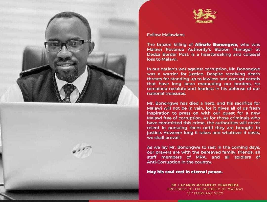Meanwhile, police in Malawi are investigating the death of Mr. Alinafe Bonongwe, a Malawi Revenue Authority Dedza Station Manager who was found dead on 4 February 2022 at his house in Dedza district.